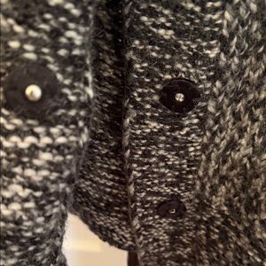 Cozy open-front Warm sweater jacket, soft knit blend with 42% wool and 27% alpaca for added warmth and texture.” by Ann Taylor LOFT in a black and cream marled knit. Features a soft shawl-style collar, 3/4 sleeves, and a textured, structured feel that works as a lightweight jacket or cardigan layer. Easy to dress up or down for fall and winter.