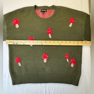 Cozy Olive green sweater featuring a playful red mushroom pattern. Perfect for adding a touch of whimsy to your wardrobe. Warm and thick.