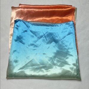 Elegant satin scarf with a blend of orange, cream, and blue hues. Perfect for adding a touch of color to any outfit.