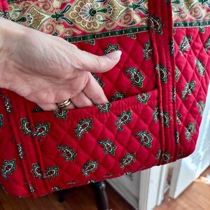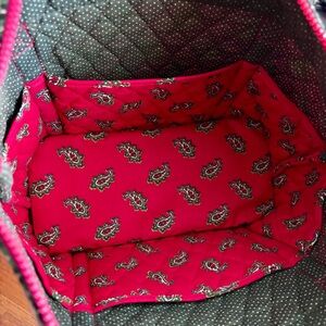 Beautiful vintage Vera Bradley quilted tote in vibrant red Paisley print with gold and green accents and amazing interior organization pockets and removable hard bottom for structure. Red zipper top close and one exterior slip pocket. In great condition with no issues. Approximate measurements are: 15w x 11t x 5 deep. Straps are 10" Long.