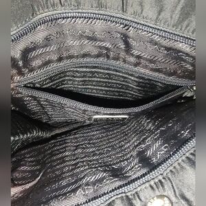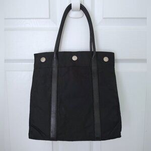 Authentic Vintage Prada nylon small tote with leather trim, decorative snap button hardware, zip top closure, and interior pocket. In excellent preloved condition. There is discoloration on the interior but the exterior is in fantastic shape, no corner issues, discoloration, etc.!