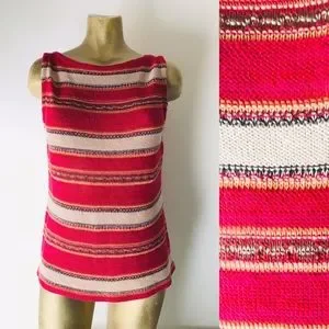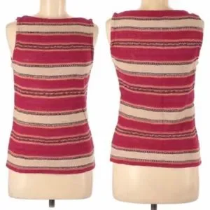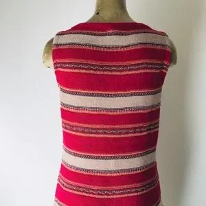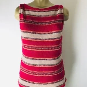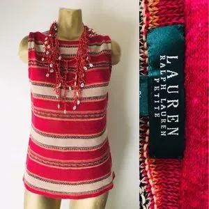 This is a classic striped linen-blend top by LAUREN Ralph Lauren Petite size PL. Fabric is 87% linen, 13% cotton and is hand-washable. Item is new-without-tags. Color is fuchsia, tan, taupe and navy. Item slips on over-the-head. Approximate unstretched measurements are 36 inches at bust, 34 inches at waist, 38 inches at hips, 25 inches in length. Accessories not included.