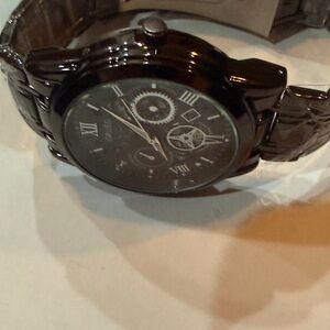 Stylish Oruss watch with a black skeleton dial. Features Roman numerals and intricate gear design.