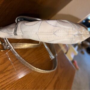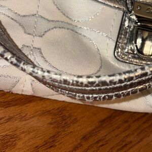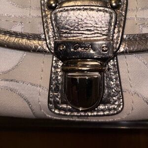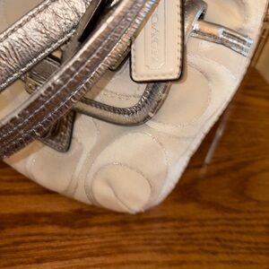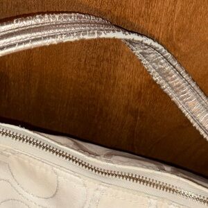 Coach Poppy silver and sateen shoulder bag. I rated this bag as “fair” due to some blemishes on the fabric and peeling on the straps. It’s been loved, but still had a ton of life in it.