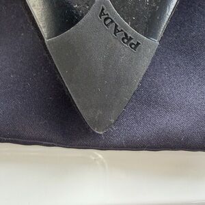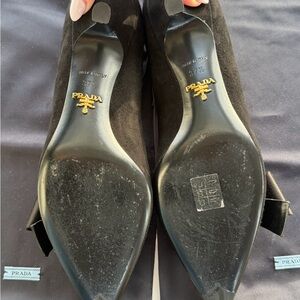 Chic black heels by Prada with elegant satin bow detail. Ideal for stylish events.