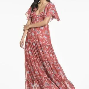 Sachin + Babi Floral Kara Maxi Dress in red. Crafted from flowing red chiffon, this dress features a flattering V-neckline and short flutter sleeves. The maxi length is adorned with delicate, floaty tiers. A side zipper closure ensures a tailored fit, while the vibrant floral pattern adds an air of sophistication. Perfect for weddings, formal events, or an elevated evening out, this dress is a true statement of timeless beauty