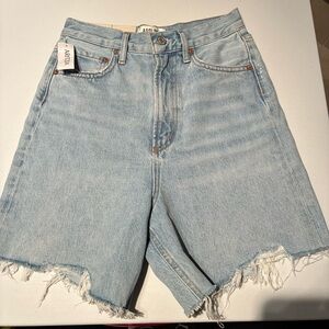 NEW WITH TAGS Agolde Stella Shorts. Colour is Agreement, a light blue denim wash with intentional distressed details/raw distressed hem. High rise shorts with a zip fly. Relaxed baggy leg fit, perfect comfortable shorts that give you room to move around! Long line raw hem. Super on trend. As sold on Revolve, Aritzia etc… Excellent new with tags condition, please note some faint marks on back of leg, looks like regular consistency of the denim but disclosing nonetheless. Organic and recycled cotton blends. Size 23.