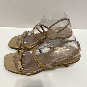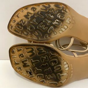 Chic gold strappy heels by Stuart Weitzman. Ideal for elevating any outfit.