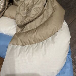 As shown there is some slight yellowing on the white. Minor markings on the right shoulder and on the left sleeve.