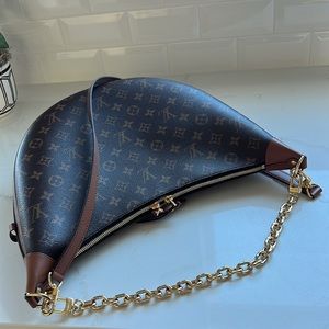 Elegant Louis Vuitton hobo bag. Features iconic monogram pattern. Gold chain detail. Perfect for any occasion.