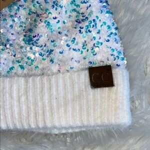 🆕 CC Cuffed Beanie Hat Womens One Size White with Sparkly Sequins and Pom Pom