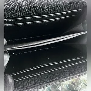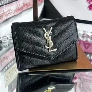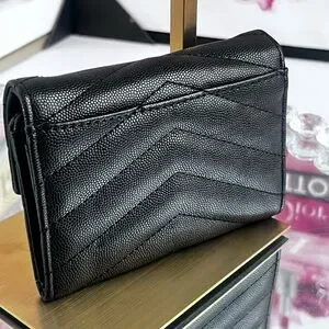 Chic black wallet with chevron pattern. Features iconic YSL logo in silver. Compact and stylish design.