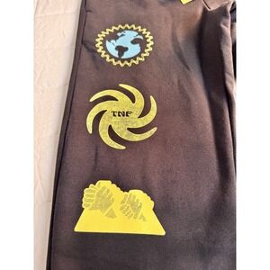 The North Face TNF Black Snow sweatpants in men's size XS. These joggers feature a standard fit and are adorned with unique graphic prints on the left leg including a globe, a swirling vortex with 'TNF' in the center, and a stylized mountain landscape.