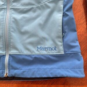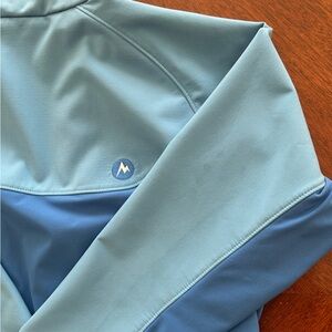 Sky blue Marmot jacket with full zip. Perfect for outdoor activities.