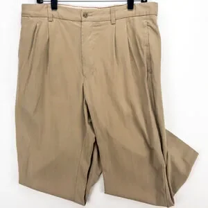 Banana Republic pleated silk-blend pants in tan, tagged 34x30 and fit like 36x29. Relaxed straight-leg cut with crisp pleats and breathable woven fabric. Smart enough for office wear, comfortable enough for travel. Lightweight and breathable with a polished finish.