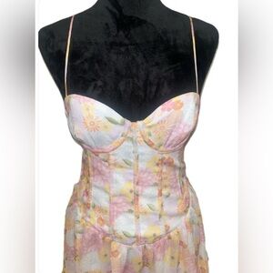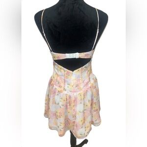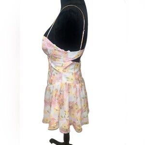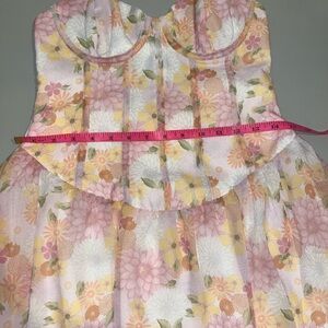Bright blooms mini dress with underwire cups and corset details along bodice. High-Low waist seam and flouncy skirt. NWOT.