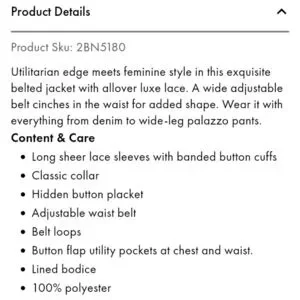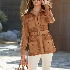 This elegant lace jacket features a stylish design with a belt for a flattering fit. Perfect for adding a touch of sophistication to any outfit.