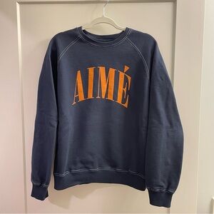 Stylish navy sweatshirt with bold orange 'AIMÉ' print. Comfortable and trendy.