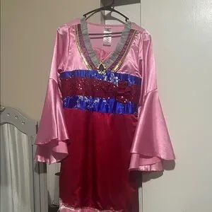 This is a Disney Store Mulan costume dress for girls, featuring a satin dress, belt, and sash with simulated embroidery and metallic foil detailing. Worn once, bought from Bippity Boppity Boutique.