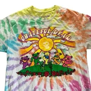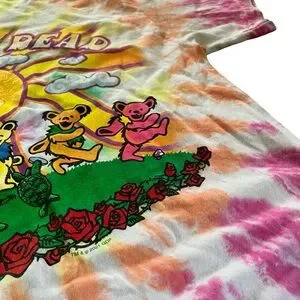 Colorful tie-dye shirt with Grateful Dead bears. Fun and vibrant design.