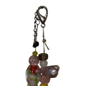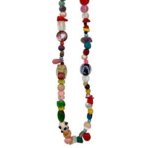 This is a zany, weighty strand, for those who like their accessories to make a statement! Made in South Africa, featuring dozens of different colourful glass beads on wire. The two large "centerpiece" beads are almost an inch in width.