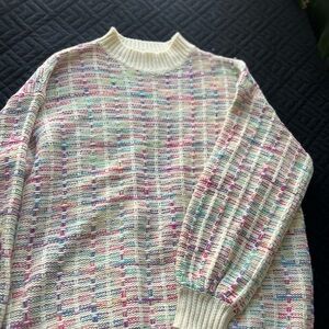 Chic and cozy crew neck sweaters. Cream and vibrant multicolor design. Perfect for layering.
