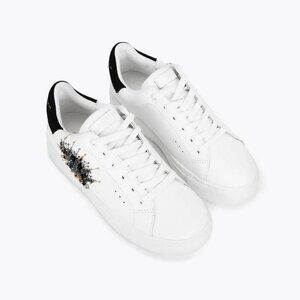 The Laney Eye sneaker is crafted from a white leather with classic lace up front. The side features an eye motif comprising of multiple crystals. The heel is finished with black suede with gold foil logo.