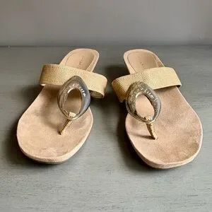 Anne Klein AK Women Tan Wedge Sandal Slide Thong Size 8M Neutral Gold Circle Summer Coastal