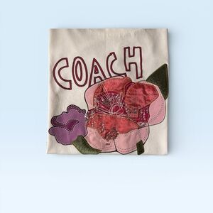 This item is an authentic Coach Poppy graphic t-shirt. The Coach Poppy collection was a popular line known for its vibrant colors, playful designs, and youthful aesthetic, often featuring floral motifs like the one seen here.
