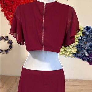 Get swept off your feet in the Lulus Garden Bliss Burgundy Cutout Maxi Dress! Elegant chiffon shapes this stunning dress featuring a rounded neckline, short fluttery sleeves, and a darted bodice. High fitted waist tops a cascading maxi skirt with a stunning side slit, while a back cutout adds a little something extra that's sure to turn heads. Exposed silver zipper at back, plus hidden side zipper/clasp.