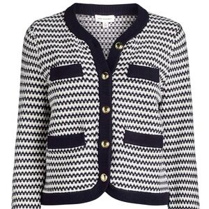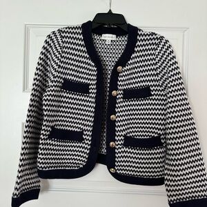 Chic and stylish navy and white sweater perfect for any occasion. Features a chevron design with a comfortable fit.
