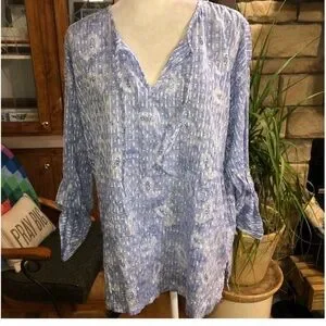 PURE JILL SIZE LARGE BLUE & WHITE PAISLEY BLOUSE 3/4 SLEEVE V/NECK W/TIES EUC