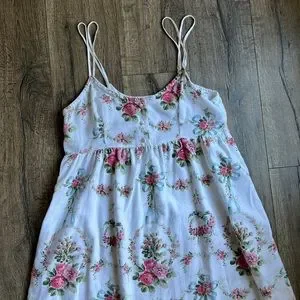 Elegant floral nightgown. Features delicate pink flowers with a sweet blue bow on a white background. Satin spaghetti straps for a comfortable fit, they are not adjustable.