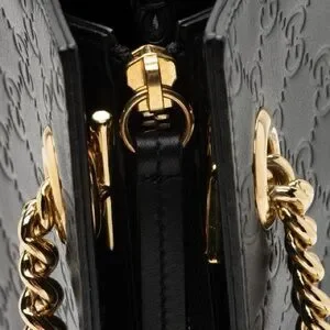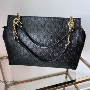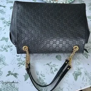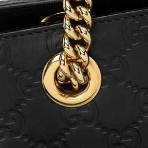 Chic Gucci shoulder bag in black leather. Features embossed logo pattern. Gold chain straps add elegance. In great used condition. Check the closet for more designer items.