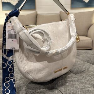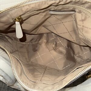Elevate your style with the Michael Kors White Leather Shoulder Bag. This elegant bag features a sleek design, perfect for any occasion. Crafted from high-quality leather, it offers both durability and sophistication. The white color adds a touch of class to your ensemble.