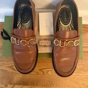 Elegant Gucci loafers in papaya brown Italian leather. Features gold-tone logo detail. Classic loafer; trending style with men’s inspired / preppy vibe. Super comfortable and versatile. Previously worn and in excellent condition. Comes with all original packaging (box, authenticity card, dust bag). Priced to sell! They need a great home ❤️