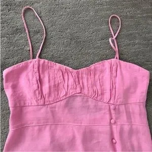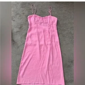 Elegant pink midi dress with spaghetti straps. Features a side slit and button details.