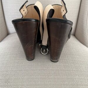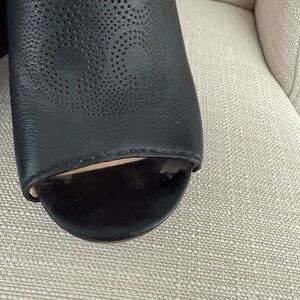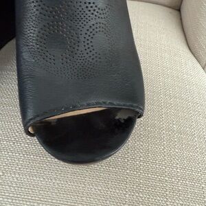 Chic black leather mules by Coach. Features a stylish slingback design. Heel measures about 5”. Size is “8b” but they run small. Shoes show normal signs of wear…please review photos before purchasing. From a smoke free home!
