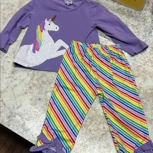 Delight your little one with this charming kids matching set featuring a purple unicorn top and vibrant rainbow-striped pants. Perfect for playful days.