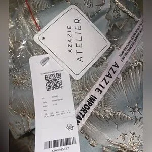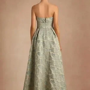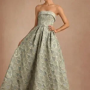Stunning strapless gown with floral pattern. Features a blue sage base with gold accents. Perfect for formal events.