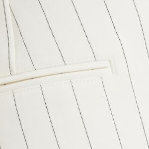 These striped high-waisted pants from GANNI are designed for a relaxed fit, tapered at the hem. Featuring stitched front creases, two side slant pockets, two back welt pockets, button and concealed zip fastening at front. Color is white with black pinstripes.