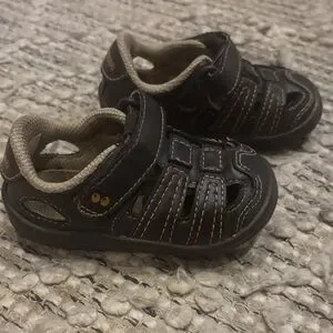 Stylish black sandals with tan details. Secure Velcro closure. Perfect for active kids.