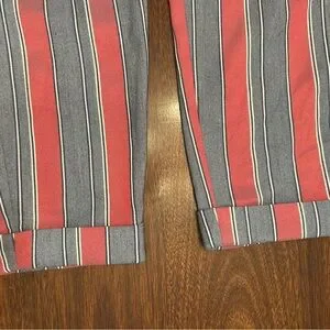 Stylish cropped pants with bold red and gray stripes. Perfect for a modern look.