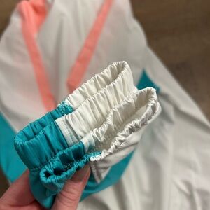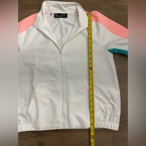Under Armour jacket in white with pink and teal details. Ideal for active wear. Super light, great running or spring jacket/wind breaker. Size medium, in like new condition. Gorgeous colour block, retro vibe