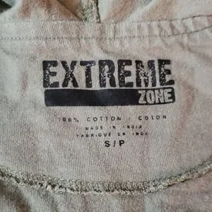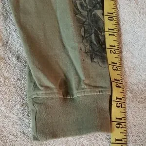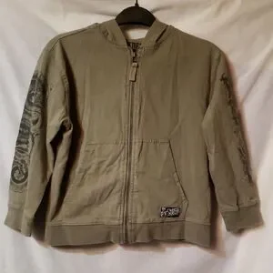 Trendy olive hoodie for kids featuring stylish graphic sleeves and back. Perfect for casual outings. Great shape, light pilling