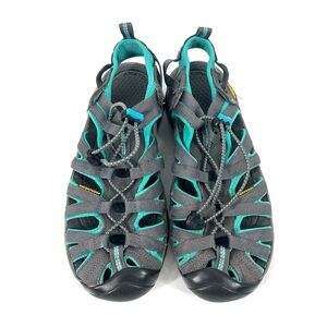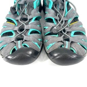KEEN Whisper Sandals Womens 8.5 Grey Blue Trim Water Hiking Sport Straps Shoes. Excellent preowned condition. Gently worn, light wear, no structural flaws. These shoes come from a smoke free, pet free home.