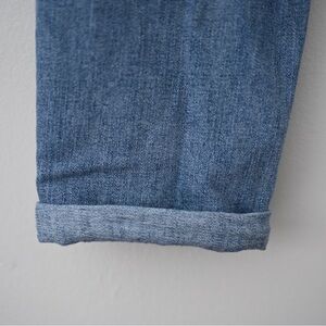 Distressed detailing at the knees and surrounding pockets. The classic five-pocket styling and signature leather brand patch in a deep navy blue add a touch of timeless appeal with a modern twist.