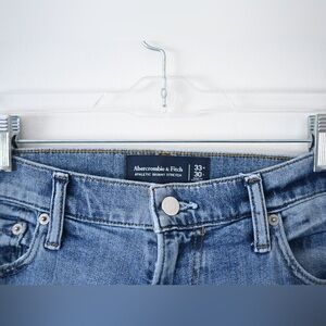 Keywords: Abercrombie Jeans, Mens Denim, Athletic Fit, Skinny Jeans, Stretch Denim, Light Blue Wash, Casual Wear, Comfortable, Modern Style, Everyday, Versatile, Classic Denim, Five Pocket, Distressed