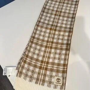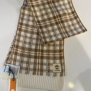 Stylish Timberland scarf with a brown and cream plaid pattern. Perfect for adding warmth and style.