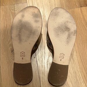Stylish tan suede sandals with vibrant floral embroidery and beading. Perfect for any casual outing. Size 8. Minimal wear on bottom as pictured.